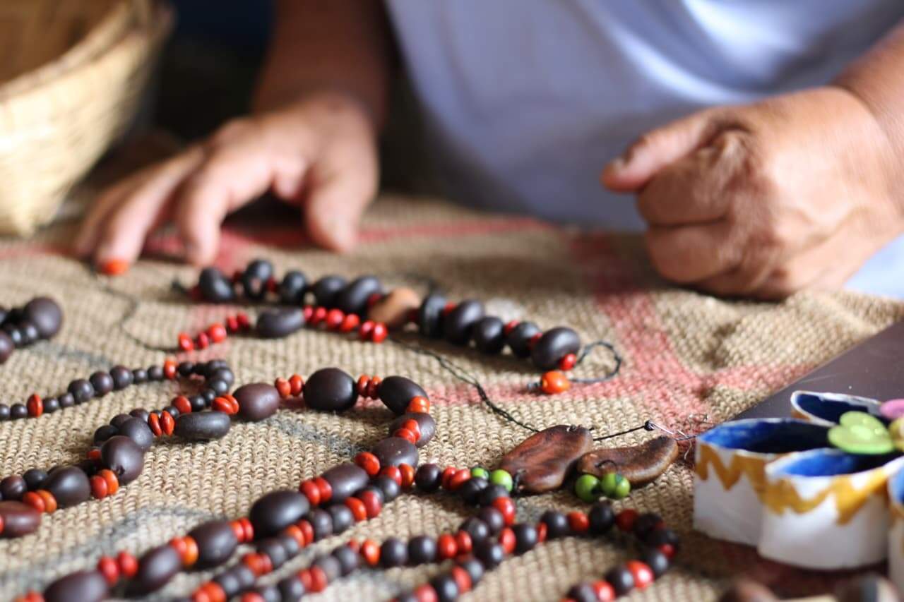 “Tem a semente de saboneteira também e o bambu que uso. As pessoas procuram todos; eu benzo tudo; estão todos ungidos. Isso é uma prática minha mesmo. Faço benzeção desde os 30 anos. Inclusive, quando entrei no turismo, a comunidade me escolheu para expor aqui porque eu benzo e faço artesanato”, comenta Hilda Vicente Pereira.