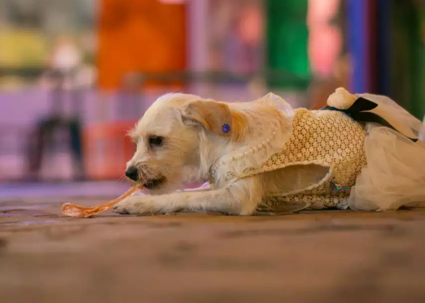 "Ela é um fiapinho de manga e no dia do casamento mesmo eu decidi que ela ia com a gente que lá pode cachorro e aí fui atrás de uma roupinha, pedi para minha amiga ficar responsável por ela lá mas ela se comportou bem deu tudo certo".