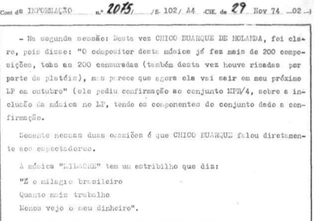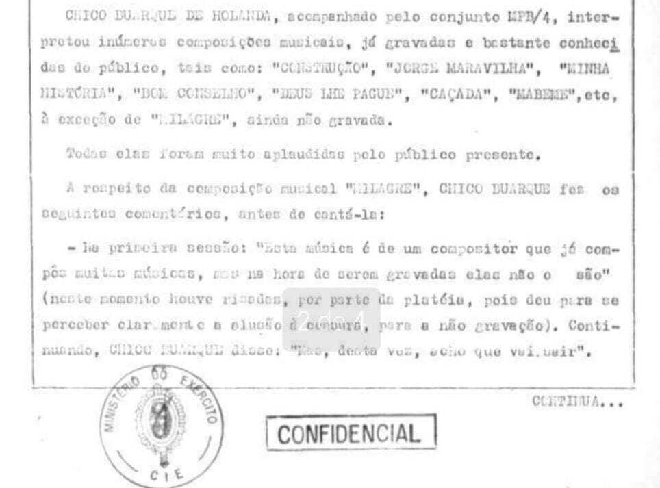 “A respeito da composição musical “Milagre”, ainda não gravada, Chico Buarque fez os seguintes comentários, antes de cantá-la. Na primeira sessão: “Esta música é de um compositor que já compôs muitas músicas, mas na hora de serem gravadas elas não o são” (neste momento houve risadas por parte da plateia, pois deu para se perceber claramente a alusão à censura para a não gravação). Continuando, Chico Buarque disse: “Mas agora vai, acho que vai sair”, diz trecho do documento de duas páginas.
