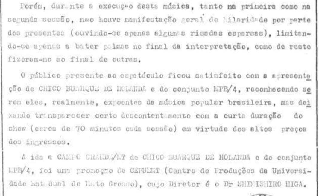 Dentro desse contexto, o show em Campo Grande foi registrado em um documento oficial classificado como “Confidencial”, enviado ao gabinete do ministro do Exército no dia 29 de novembro de 1974, e distribuído entre órgãos de inteligência. Nele, um agente da 9ª Região Militar descreve os detalhes da apresentação de Chico e do MPB-4, inclusive, citando as reações da plateia.