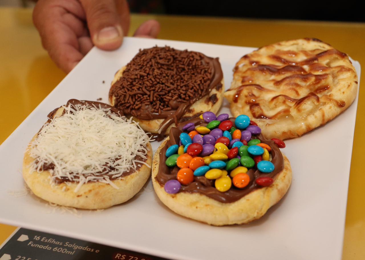 Por lá, tem esfirra de todos os sabores, desde as tradicionais até recheios vegetarianos, que apostam no queijo e acompanhamentos. Hoje, cada esfirra custa R$ 4,50, mas, no começo, era R$ 1,25. Segundo João, as campeãs de venda continuam sendo as clássicas: carne, queijo e calabresa. Na parte das doces, chocolate com confete e chocolate branco com abacaxi lideram.