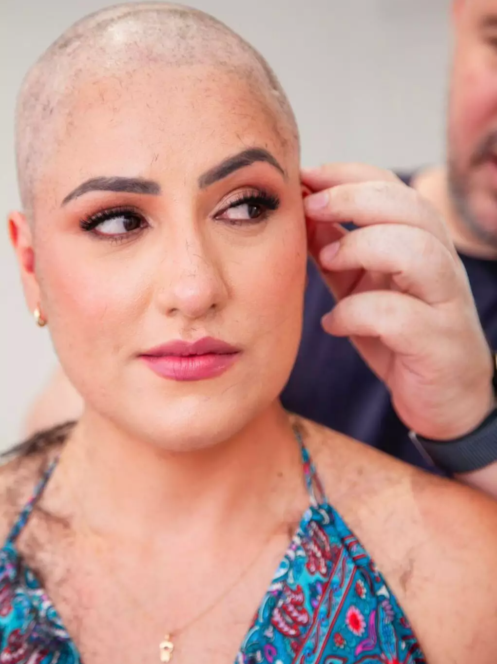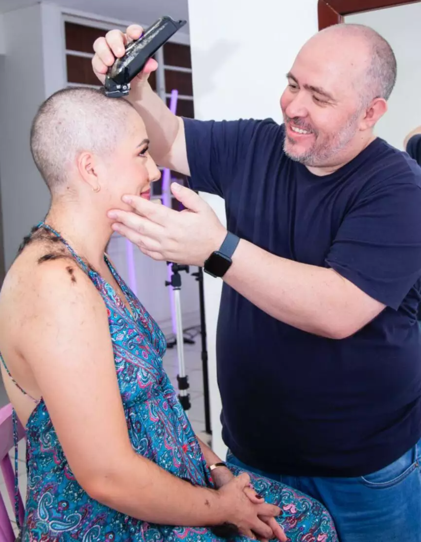Decidida a não deixar o medo dominar, marcou a raspagem e convidou a fotógrafa para registrar cada etapa. O esposo, a mãe e o filho estavam ao lado dela no dia do corte. “Foi emocionante demais”, resume.