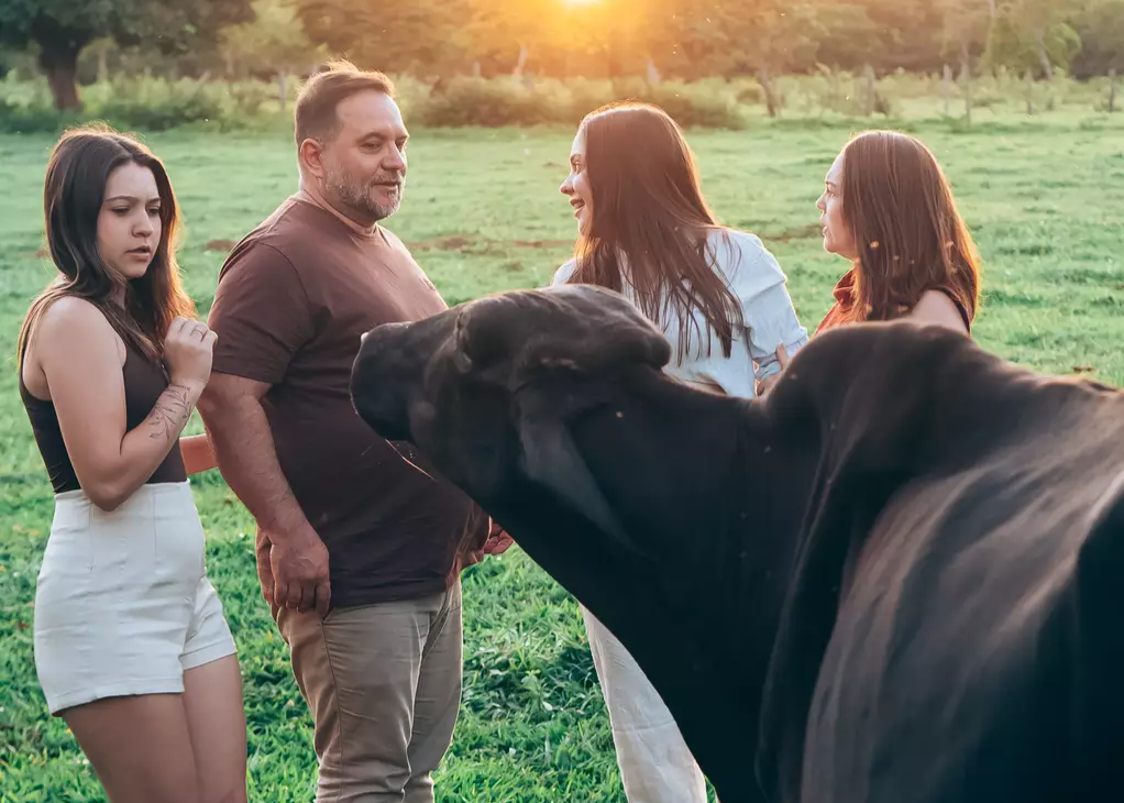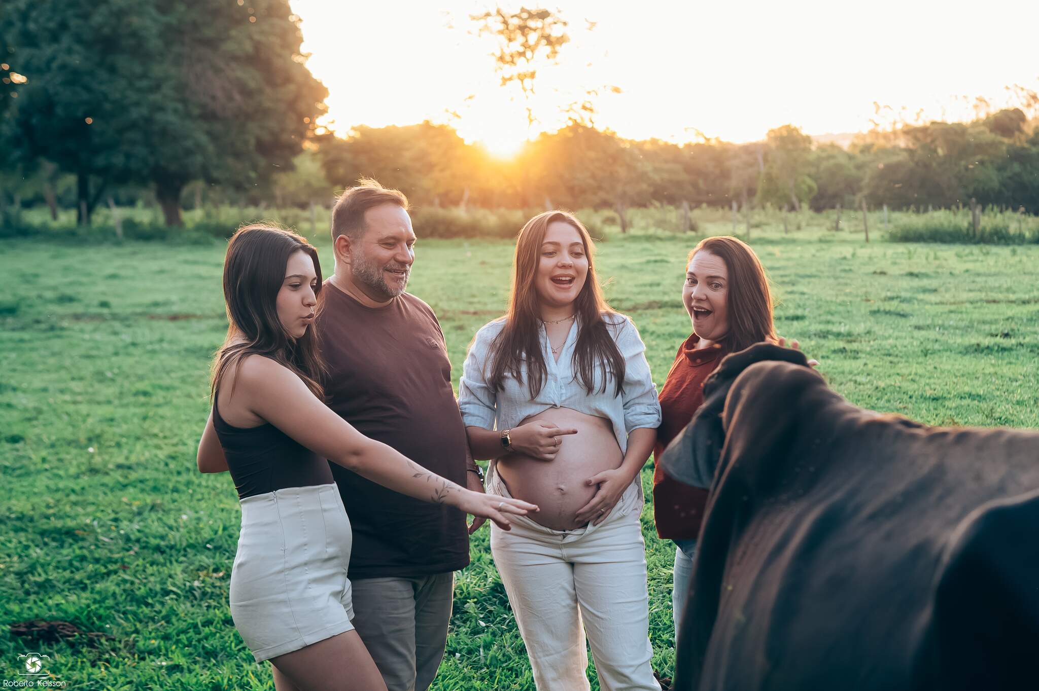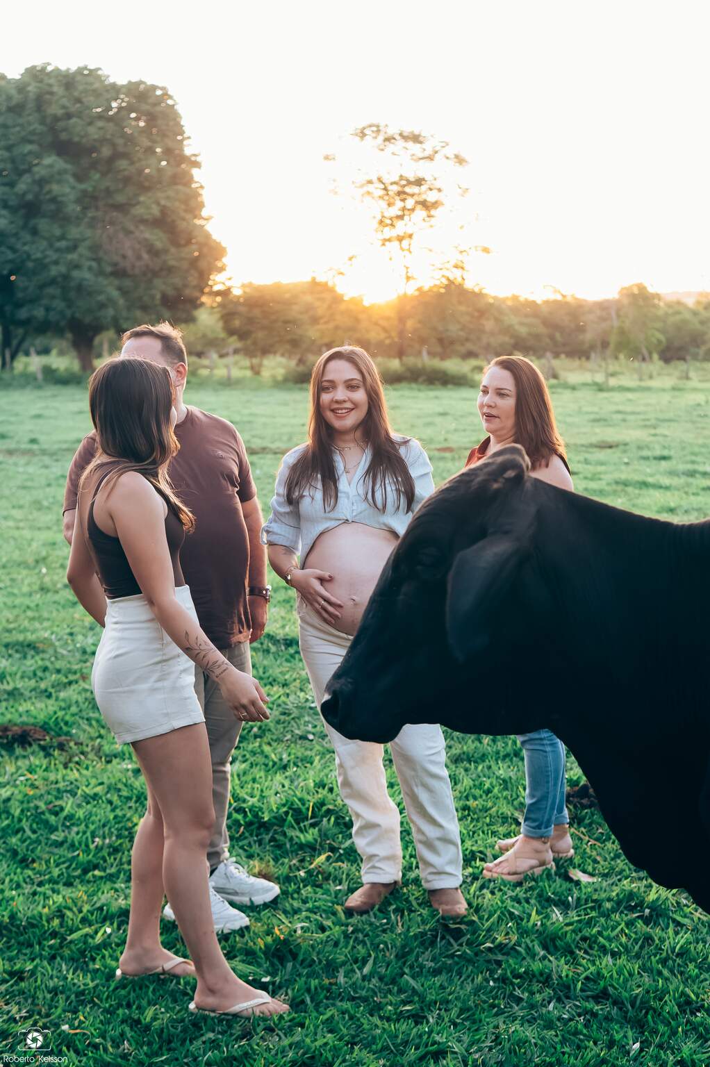 “Fomos para um lugar bonito, com o sol ao fundo, para fazer as fotos com ela primeiro, e depois com a família. Quando a família chegou, as vaquinhas ficaram curiosas e se aproximaram. As mais mansas vieram para perto de nós, e uma delas resolveu fazer o serviço dela ali mesmo, ao lado, na hora das fotos. Foi muito engraçado. Imprevistos com animais sempre acontecem.”