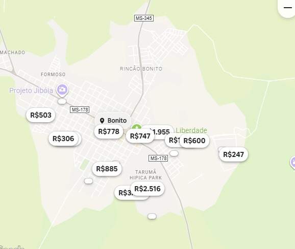 No principal site do setor, mapa mostra a média de valores das casas de temporada em Bonito (Foto: Reprodução)