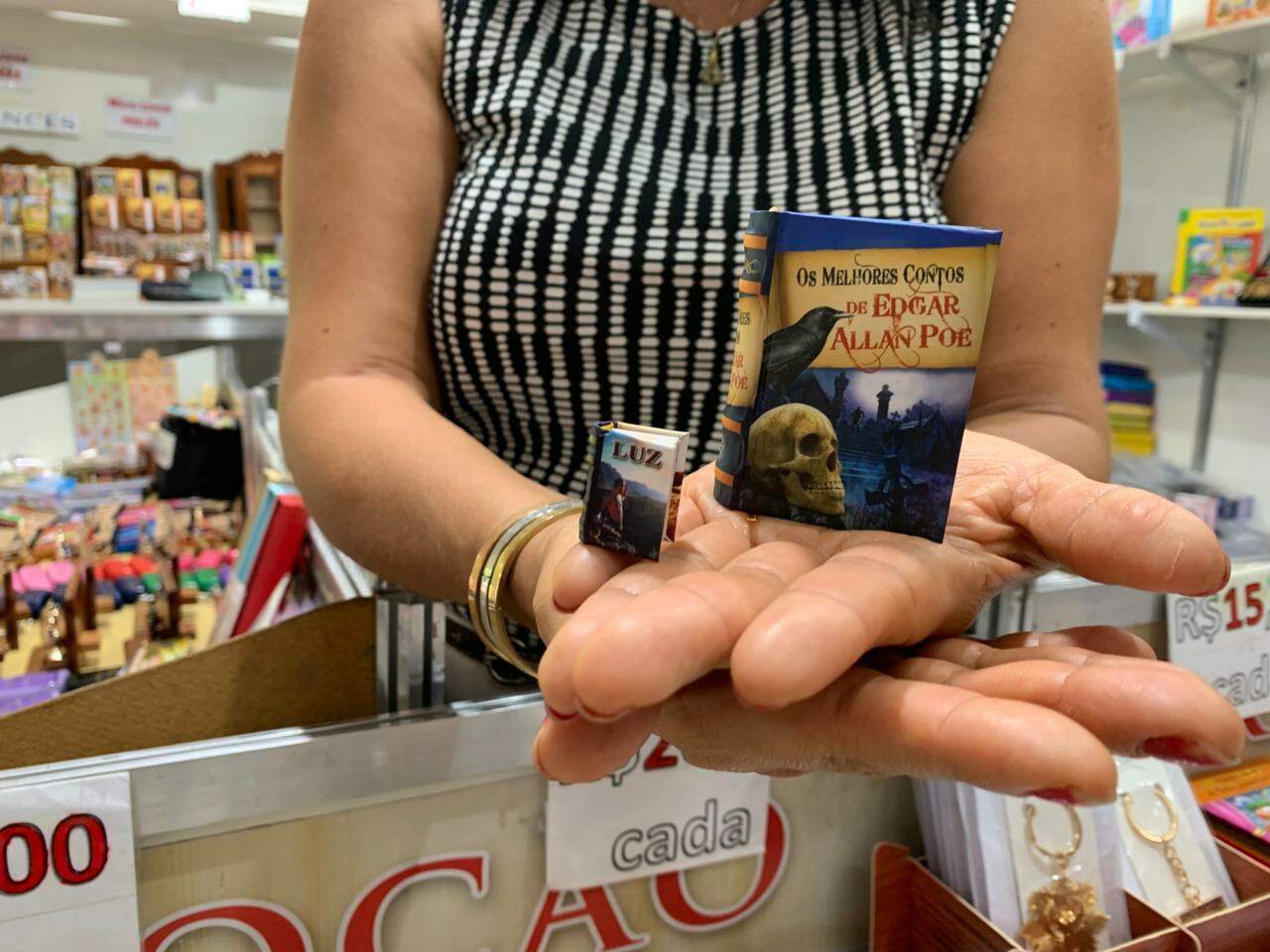 Você já viu esses livrinhos? Famosos no Peru, Xenia Luz resolveu levar minilivros menores que um polegar para a Bienal Pantanal. Entre tantos estandes repletos de cores, autores e histórias, o dela chama atenção pelo tamanho, ou melhor, pela falta dele. Eles são os menores livros da feira e costumam ser chamados de "menores livros do mundo". As obras que cabem na palma da mão e carregam versões em miniatura de clássicos mundiais em várias línguas.