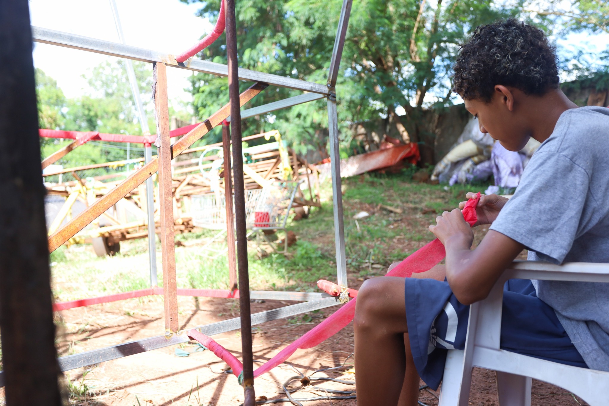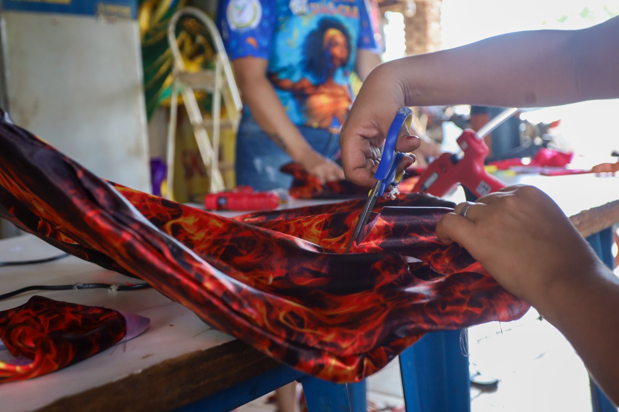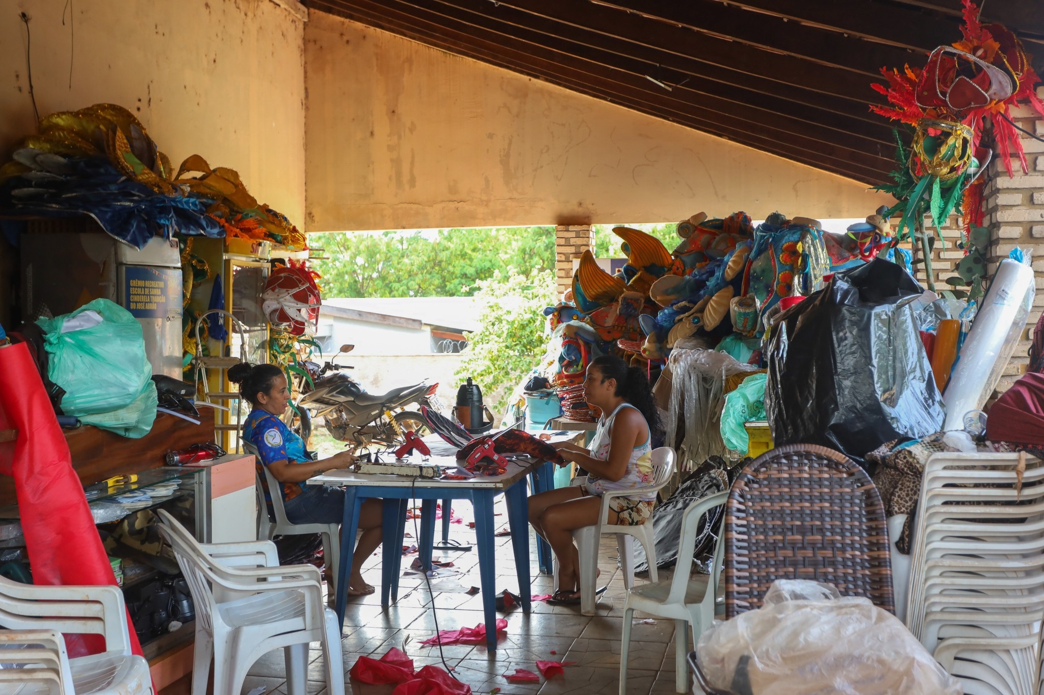 Nos barracões, o trabalho segue em ritmo intenso, a rotina começa cedo e termina tarde. “A gente inicia os trabalhos às 8h e encerra às 22h. Nos fins de semana, fazemos mutirão com todo mundo. Durante a semana, vamos revezando os dias”, conta.