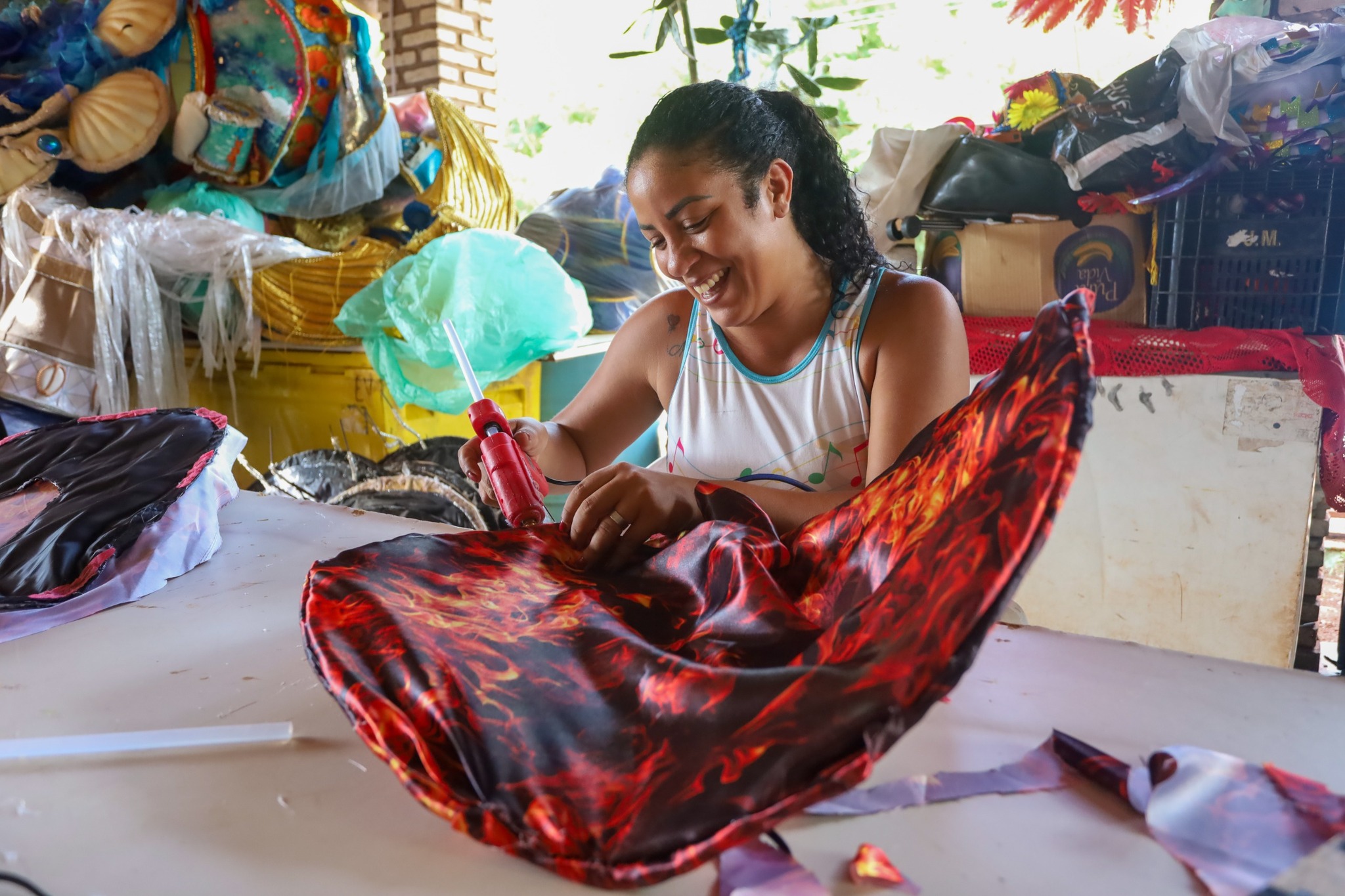 Segundo Juliana, a montagem das fantasias está na fase final. A expectativa da escola é concluir toda a confecção cerca de uma semana antes do desfile. “A montagem está a todo vapor. Vamos fazendo por partes, cada ala de uma vez, mas está quase tudo pronto, graças a Deus. Agora estamos só finalizando”, afirma.