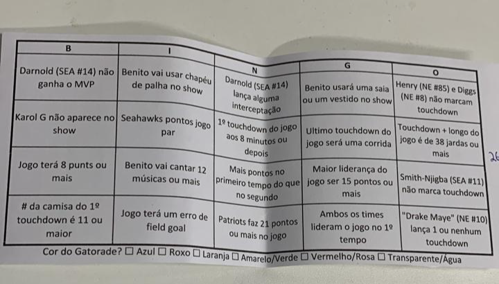 Na casa de Gabriel, de 30 anos, os amigos fazem questão de estarem juntos em um momento que, para ele, é tão significativo. Além da comilança, ainda tem um bingo “diferentão” e apostas de qual time vai ganhar a partida final. Em 2026, os Seahawks venceram os Patriots por 29 a 13 e conquistaram o título. Por lá, os palpites foram, em maioria, de que o time ganhador de fato sairia com a taça.