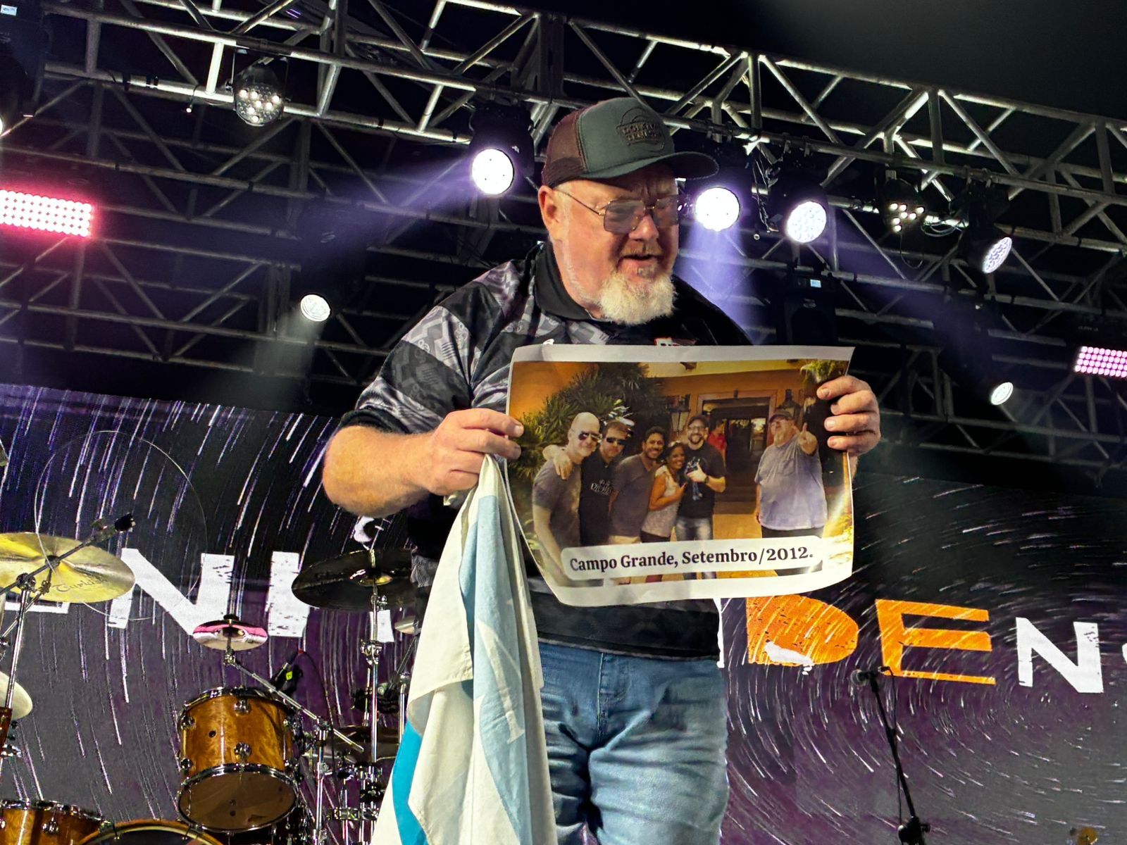 No meio da multidão, histórias que mostram como esse tipo de show faz falta nessa cidade. A professora Cristiane Maria Garcia e o arquiteto Leandro Bazoaldo guardavam uma lembrança antiga. “Foi em 2012, a gente veio de Corumbá, tirou foto com eles no hotel. Viajamos 400 km. Hoje trouxemos a foto de novo”, contaram. “Depois de 14 anos conseguimos entregar.”
