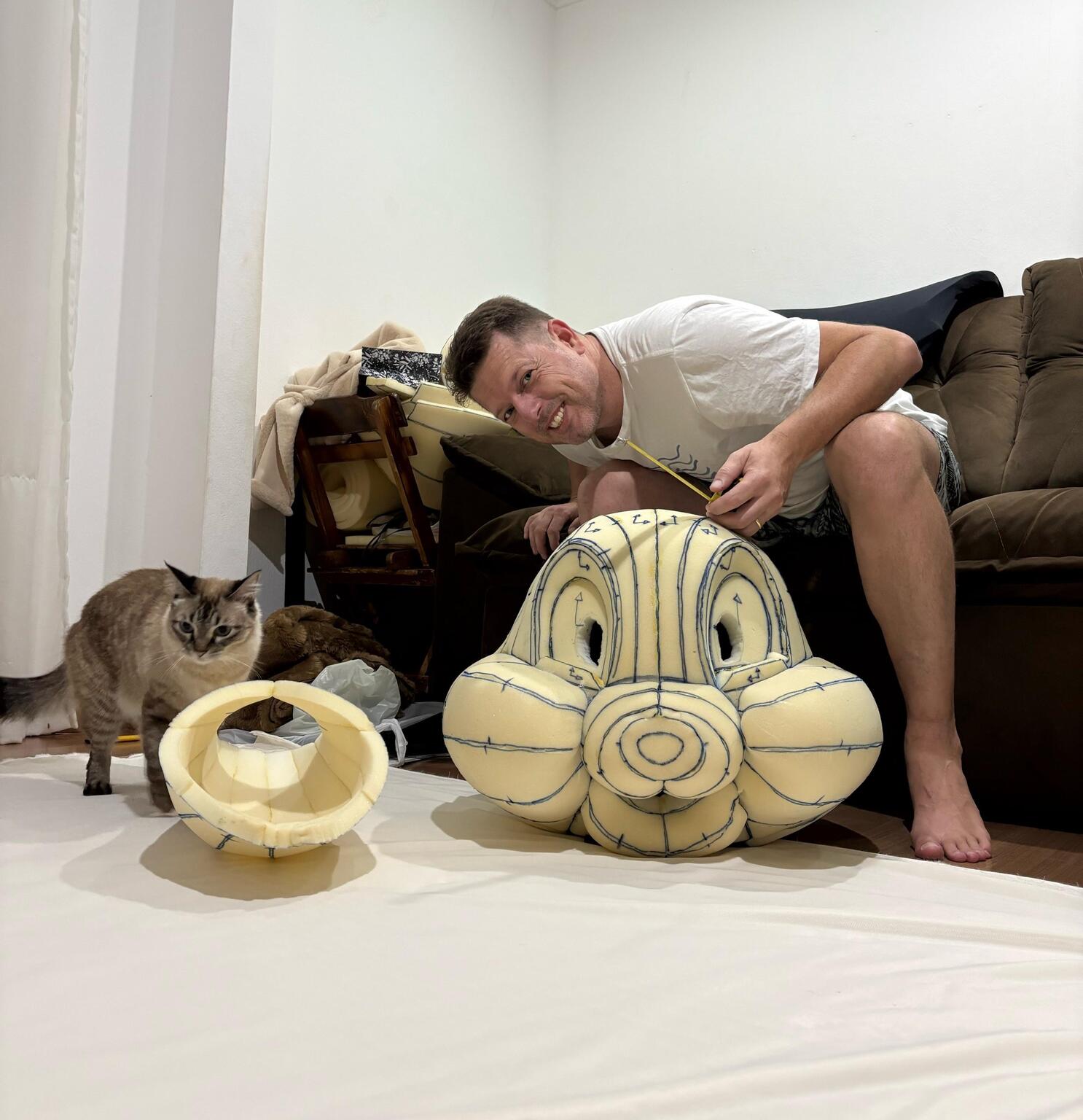 Diferente do que muita gente imagina, o figurino não foi comprado pronto. Jefferson colocou a mão na massa. Ele mesmo produziu a estrutura do coelho, usando como base um tutorial da internet. “A parte de espuma do rosto, corpo e pés fui eu que fiz. Só o macacão foi feito por uma costureira”, explica.