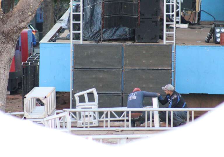 Equipe que monta as barracas e o som organiza os últimos detalhes para a festa na Praça do Rádio Clube