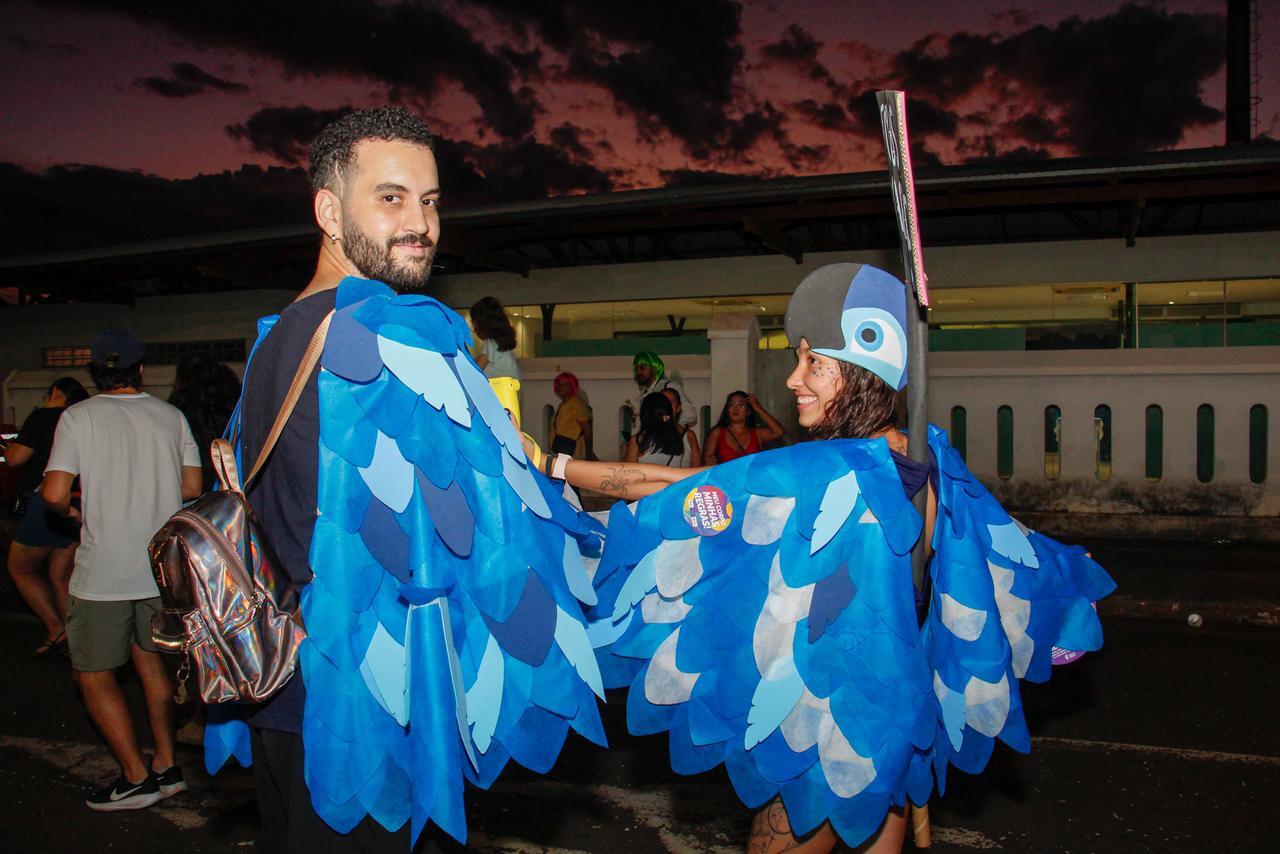Entre a multidão, a criatividade também virou negócio. Fantasiados de araras, o casal Carolina Mourão Ramos, 25 anos, e Marlon Vinicius Paixão Oliveira, 26 anos, aproveitou o movimento para vender fotos instantâneas.