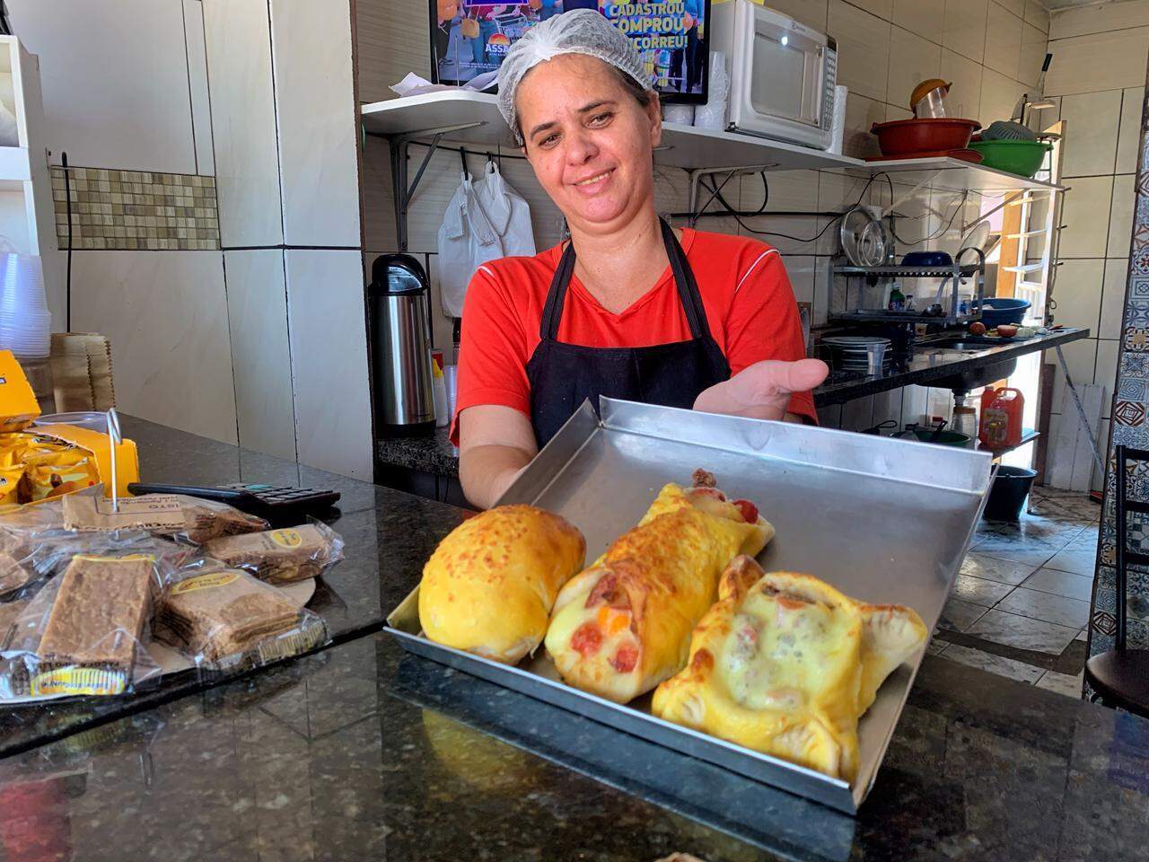 Ali, todos os dias os salgados são fresquinhos e começam a ser feitos às 4h da manhã. Só assim para conseguir dar conta dos 200 que saem por dia no pequeno negócio, em frente ao Terminal Aero Rancho. Com sorriso no rosto, ela conta que tem sido assim nos últimos 18 anos e que o espaço foi conquistado com muito esforço e parceria do marido, Lindomar Vicente Carmargo, de 51.