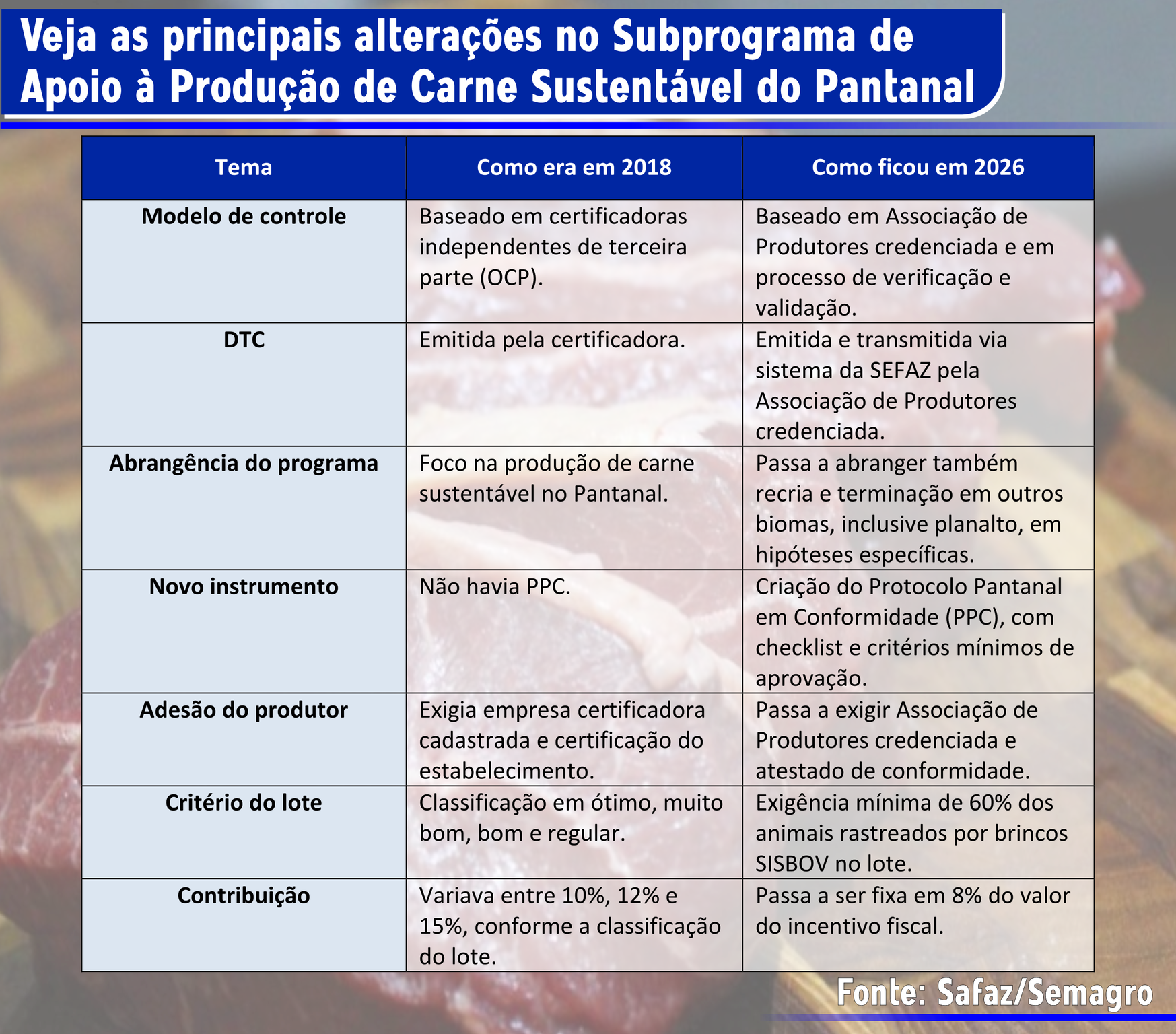 Uma outra mudança significativa é a de abrangência do programa, antes com foco somente na produção de carne sustentável no Pantanal, e que agora abre a possibilidade de que animais oriundos do bioma possam passar pela recria ou terminação em outros biomas, como o Planalto, desde que sejam do mesmo produtor rural.
