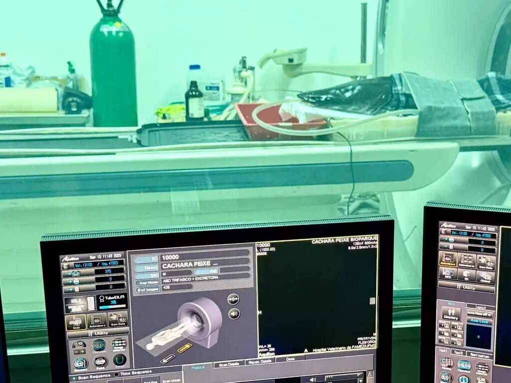 Exames – A cachara realizou ultrassonografia e tomografia em setembro. O procedimento é considerado inédito no cuidado com peixes de água doce e integra a rotina de saúde dos animais do complexo.