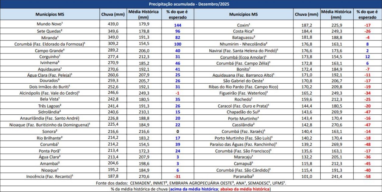 Extremos - A menor temperatura do mês foi registrada em Aral Moreira. Os termômetros marcaram 12,8°C em 17 de dezembro. A maior temperatura atingiu Porto Murtinho e foi de 39,8°C no dia 1º.