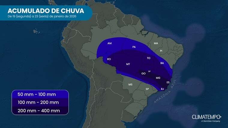 A ZCAS, fenômeno típico do verão e um dos principais responsáveis por episódios prolongados de chuva no país, deve se organizar entre segunda-feira (19) e sexta-feira (23 de janeiro). Ela é caracterizada por uma extensa faixa de umidade que se estende da região amazônica até o Sudeste, mantendo áreas de instabilidade por vários dias consecutivos.