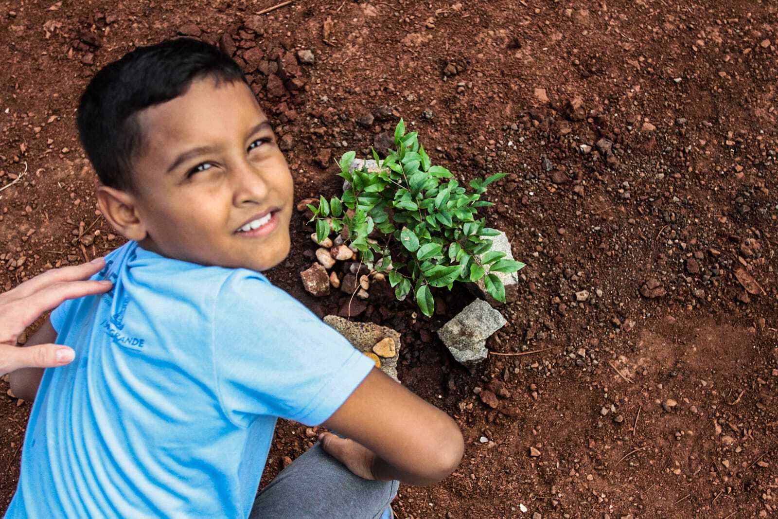 Crianças plantam árvores frutíferas em área marcada por lixo