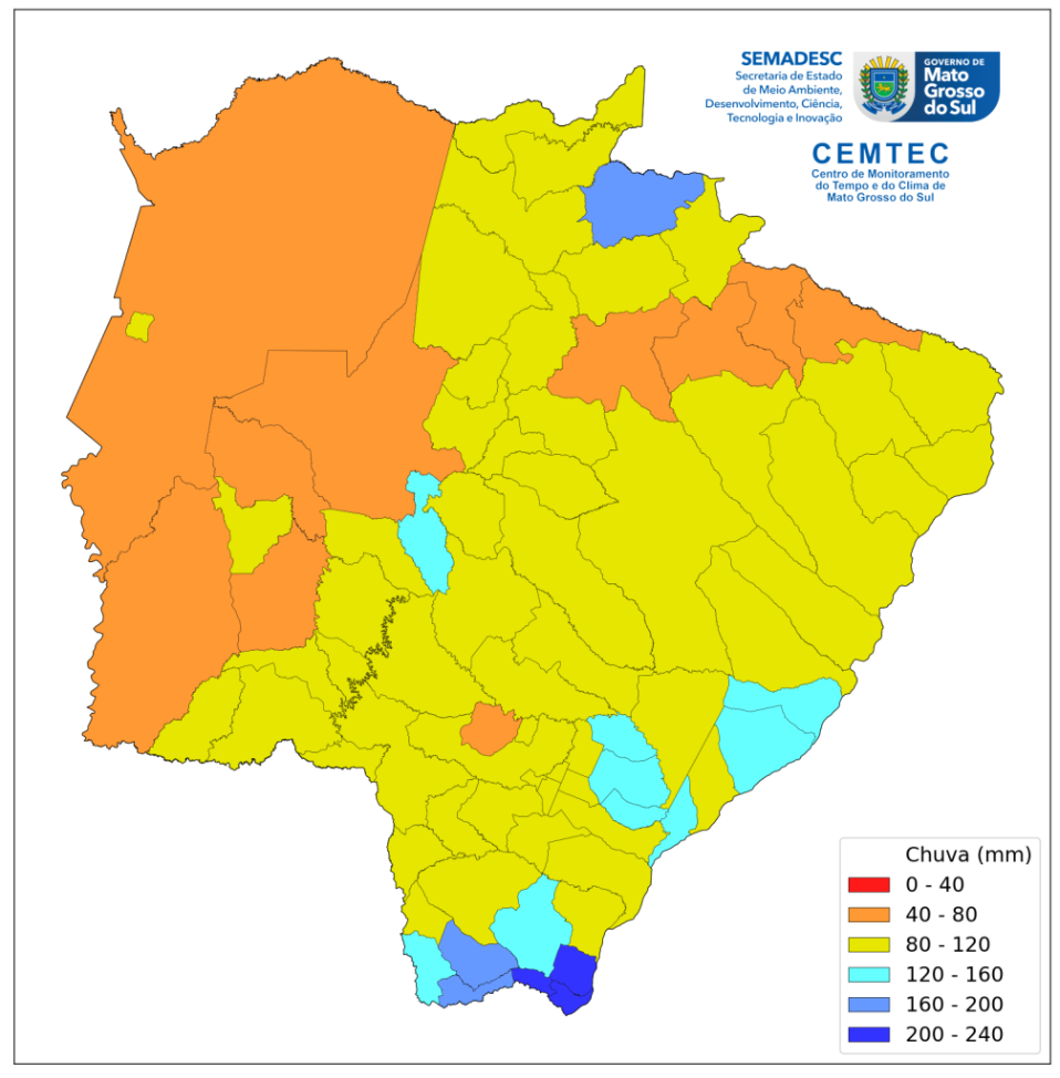 Outros municípios do interior também tiveram chuva próxima ou acima de 150 milímetros, mas ainda abaixo da média histórica. Alcinópolis registrou 193,2 milímetros, enquanto Dourados teve 162,5 milímetros. Em Sidrolândia, o acumulado chegou a 156,6 milímetros.