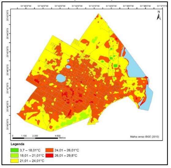 Mapa da temperatura superficial noturna em Três Lagoas, em 16 de novembro de 2019, às 21h51. (hora local) (Fonte: Reprodução)