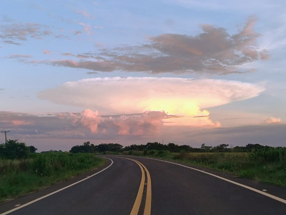 A imagem foi feita pelo engenheiro agrônomo Keuly Medina enquanto transitava pela MS-283 em direção à região, capturando a imponente estrutura já consolidada e com provável núcleo ativo no centro da nuvem.
