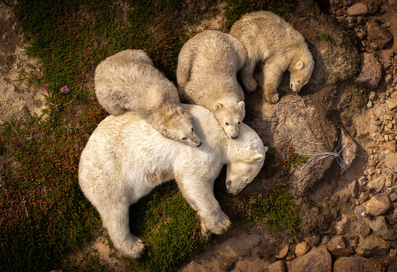 Descanso em família - Ursa polar e seus três filhotes são flagrados em um momento de pausa durante o verão, após uma longa jornada rumo ao norte ao longo da costa da Baía de Hudson, no Canadá. O registro também chama atenção para os impactos das mudanças climáticas, já que o derretimento do gelo marinho tem dificultado a caça e a busca por alimento, essenciais para a sobrevivência da espécie durante os meses mais quentes.