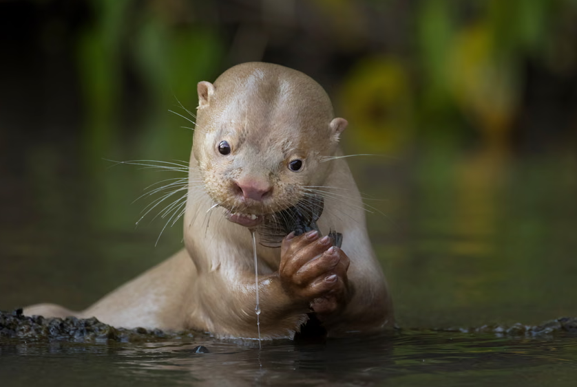 A fotografia, intitulada “Singularidade”, mostra uma lontra leucística se alimentando de um bagre
