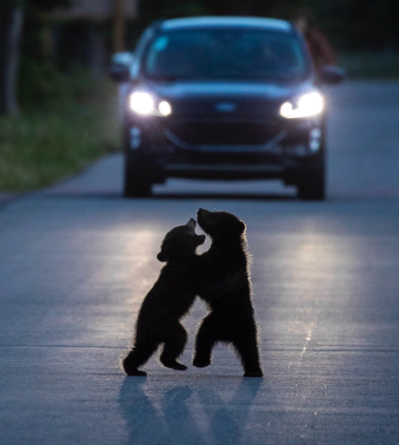 Dançando sob os Faróis - Dois filhotes de urso são flagrados brincando de lutar no meio de uma estrada tranquila no Parque Nacional de Jasper, no Canadá. Embora a presença de ursos seja relativamente comum na região, o registro de filhotes é mais raro, já que as mães costumam mantê-los afastados de possíveis ameaças.