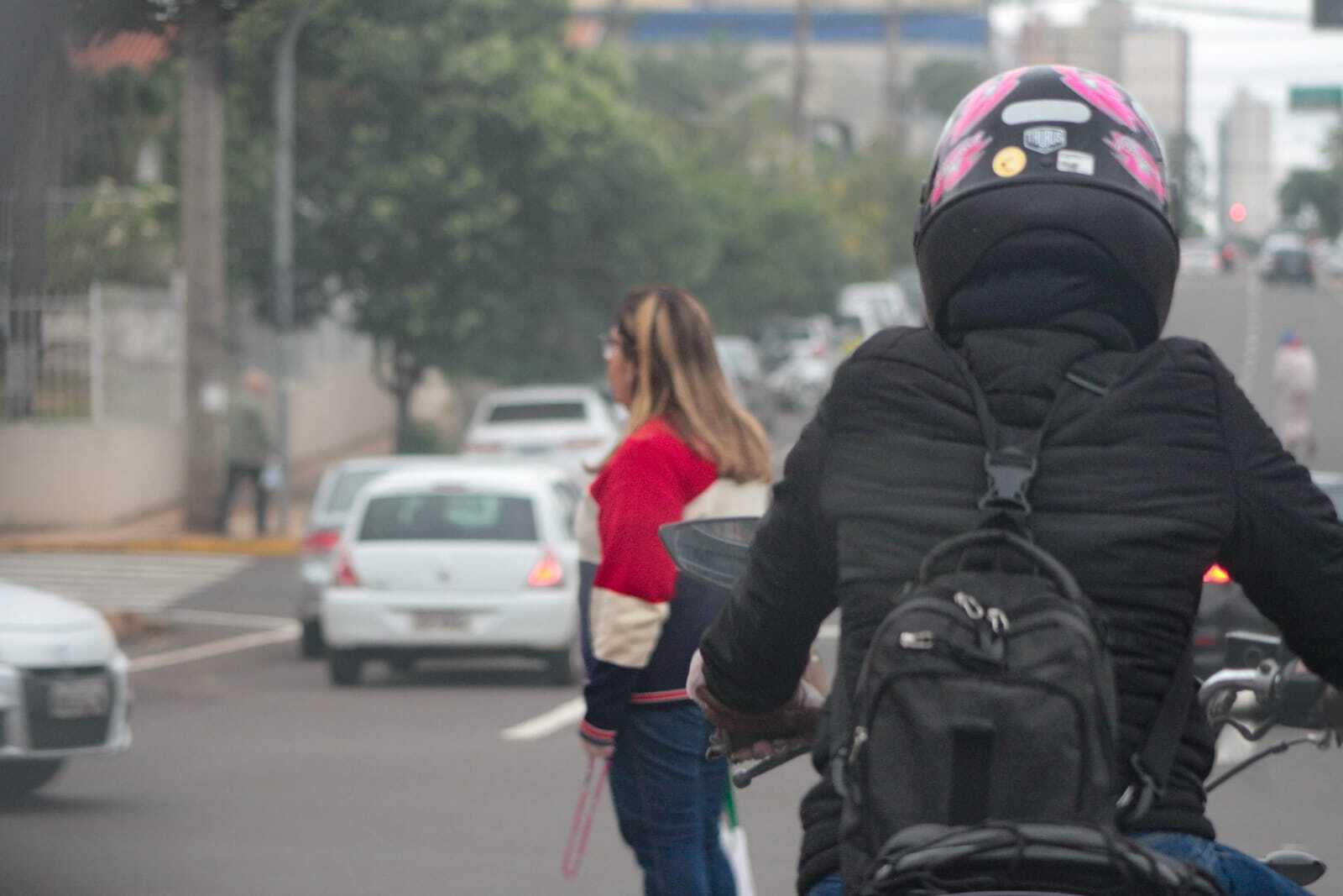 Motocicilista e pedestre usam casaco no frio da manhã em Campo Grande (Foto: Marcos Maluf)