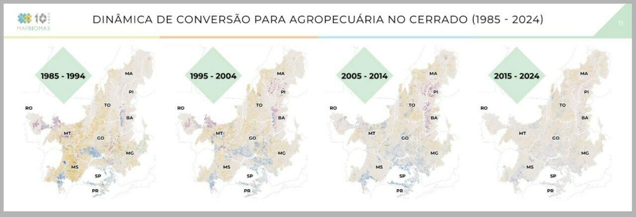 "O Cerrado vem sendo transformado em ritmo acelerado nas últimas quatro décadas. Com maior supressão da vegetação nativa entre 1985 e 1995 e depois nas décadas seguintes, a agricultura se expandiu e se intensificou, consolidando-se como região central da produção agrícola do país, principalmente de grãos", explica a analista de pesquisa do Ipam (Instituto de Pesquisa Ambiental da Amazônia), Bárbara Costa, integrante da equipe do Cerrado do MapBiomas.