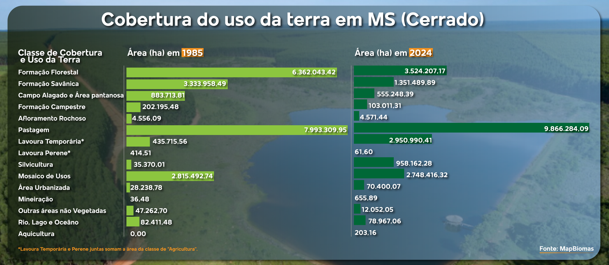 Há quatro décadas, o território sul-mato-grossense tinha 10,7 milhões de hectares de vegetação nativa. Atualmente, restam 5,5 milhões, uma perda de 5,2 milhões de hectares no período. Isso significa quase metade da cobertura original do Cerrado no Estado. No mesmo intervalo, a área ocupada por pastagens passou de 36% para 44% do bioma dentro de Mato Grosso do Sul.