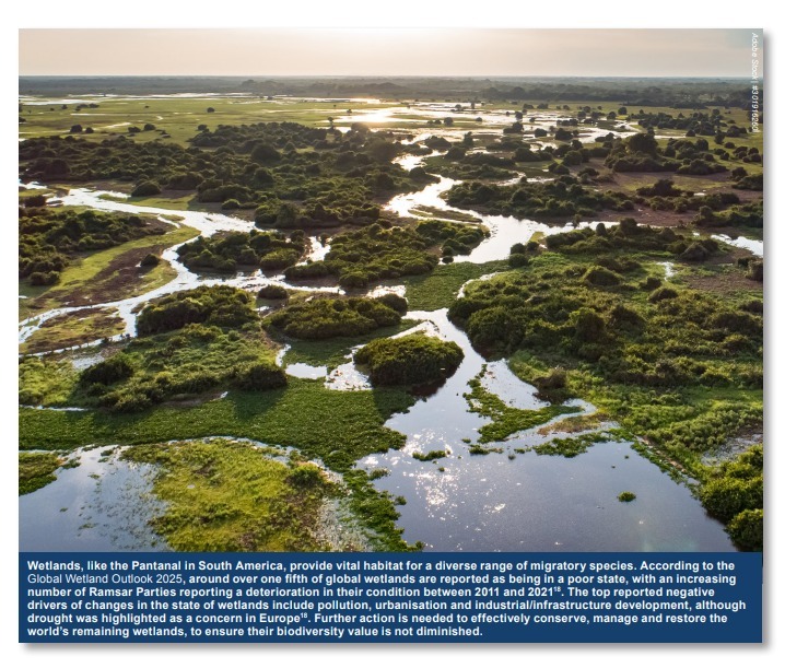 “Zonas úmidas, como o Pantanal na América do Sul, fornecem habitat vital para uma gama diversificada de espécies migratórias. De acordo com o Global Wetland Outlook 2025, mais de um quinto das zonas úmidas globais são consideradas em mau estado, com um número crescente de Partes da Convenção de Ramsar relatando deterioração em sua condição entre 2011 e 2021”, diz o texto.