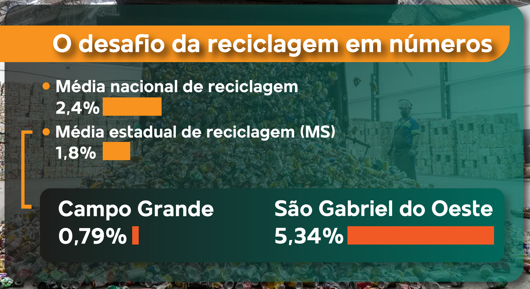 Em Campo Grande, a coleta domiciliar alcança quase 98% da população, mas apenas 0,79% do material coletado é reciclado. Em São Gabriel do Oeste, o índice de reaproveitamento chega a 5,3%, um dos mais altos do Estado, mas ainda distante de padrões considerados sustentáveis.