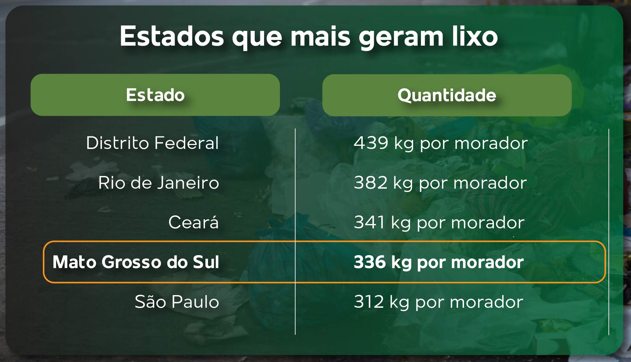 Cada habitante por aqui produz, em média, 0,92 quilo de lixo diariamente o que equivale a 336 quilos por pessoa ao ano, segundo o Anuário Estadual de Mudanças Climáticas. O volume coloca Mato Grosso do Sul em 4º lugar em geração per capita de resíduos sólidos urbanos, ficando atrás apenas do Distrito Federal, Rio de Janeiro e Ceará.