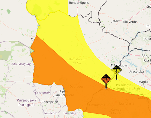 O Inmet (Instituto Nacional de Meteorologia) emitiu alertas que abrangem grande parte do estado. O aviso de perigo potencial prevê chuva entre 20 e 30 milímetros por hora, com ventos de até 60 km/h e possibilidade de queda de granizo. Já o alerta mais severo eleva os acumulados para até 60 milímetros por hora, com rajadas que podem chegar a 100 km/h, aumentando o risco de alagamentos, queda de árvores e interrupções no fornecimento de energia elétrica.