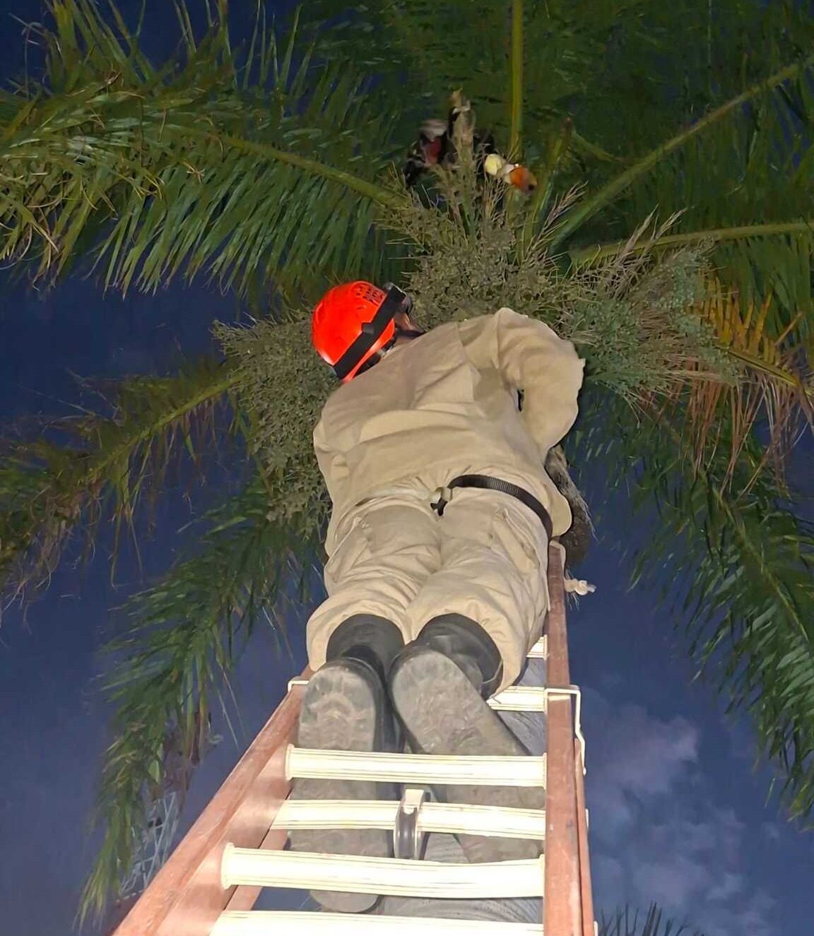 Situação deixou a ave presa no alto de uma palmeira-imperial