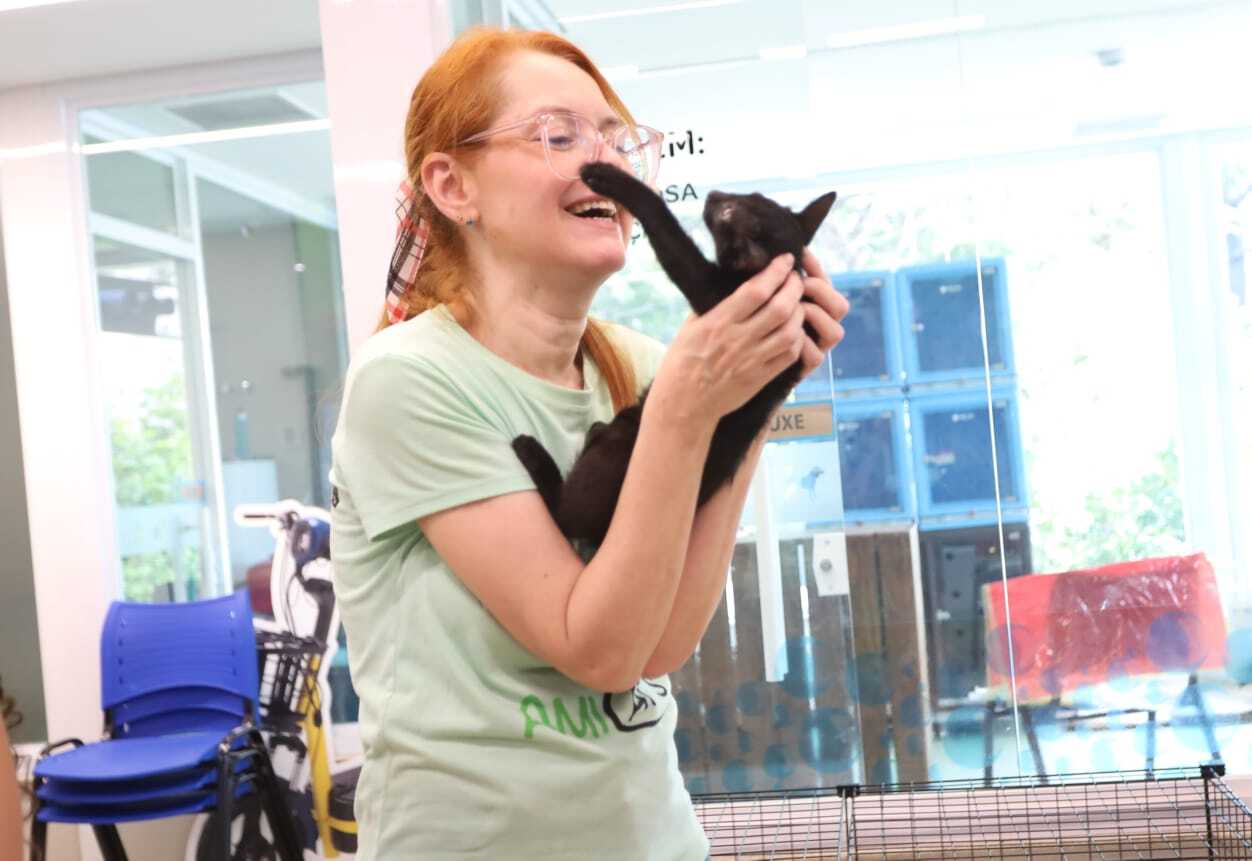 Ana Cristina Camargo, de 50 anos, presidenta da Amicats, explica que a organização funciona desde 2017 e, desde então, promove feiras de adoção. O evento de hoje é o terceiro realizado com a loja, e a intenção é que a parceria ocorra mensalmente. Os gatos disponíveis vêm principalmente de abandonos ou de colônias (áreas da cidade com muitos animais vivendo sem tutor). Embora o foco da ONG seja os felinos, há ações com cães, dependendo das parcerias.