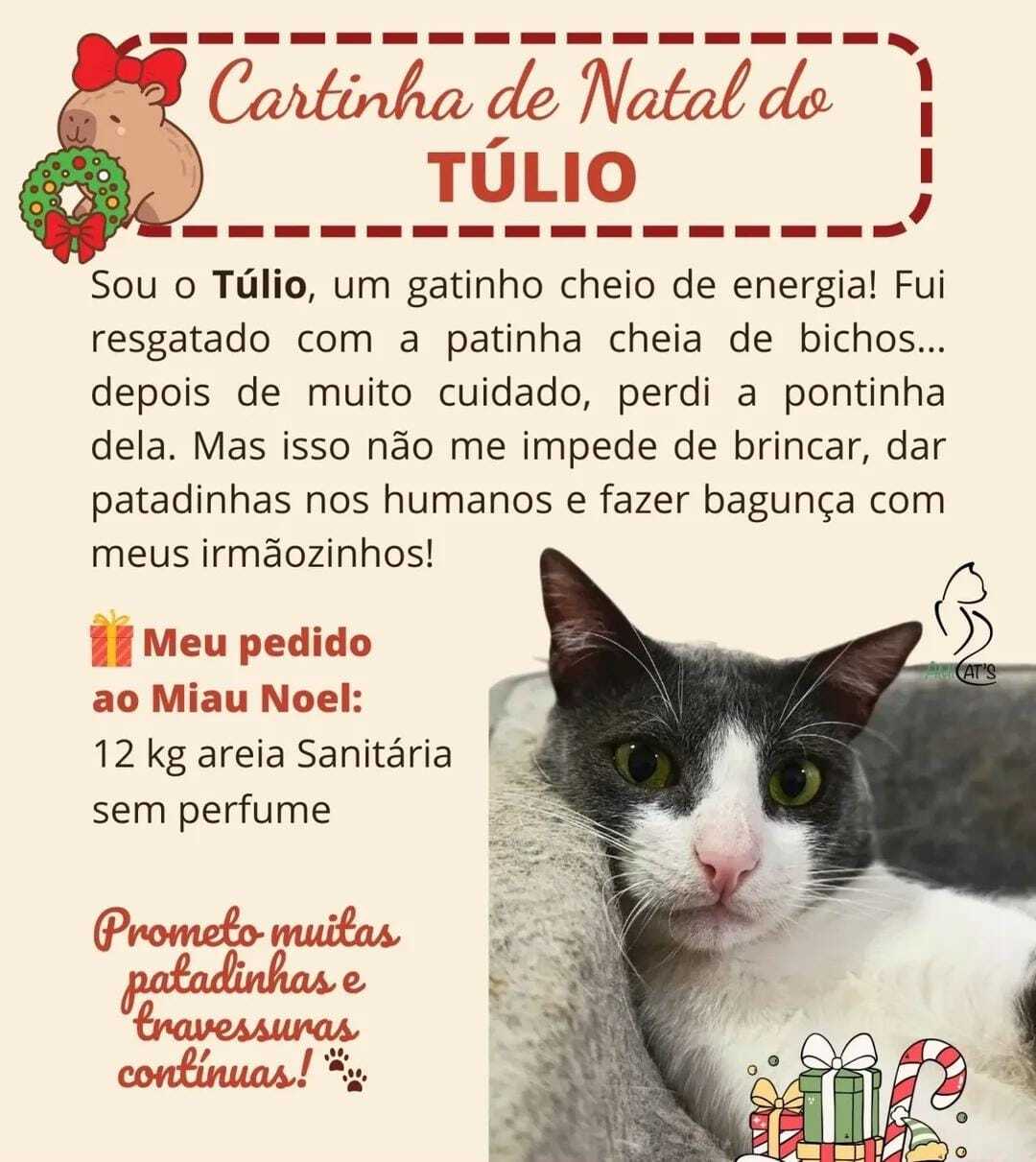 O Mário, por exemplo, aparece na campanha como um “alpinista felino”, capaz de escalar portas só para espiar os irmãos. Seu pedido ao “Miau Noel” é uma prateleira de parede ou uma caminha elevada para continuar suas aventuras. Já Túlio, que perdeu parte da patinha depois de chegar ferido ao abrigo, pediu 12 kg de areia sanitária sem perfume, item de uso coletivo e vital para o dia a dia da ONG.