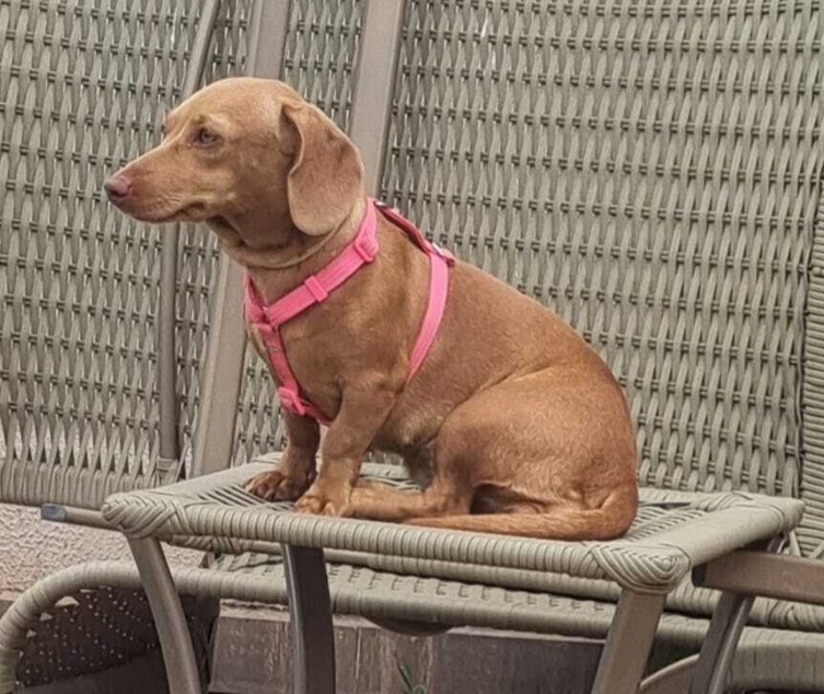 Cadelinha com coleira rosa em cadeira da família (Foto: Arquivo)