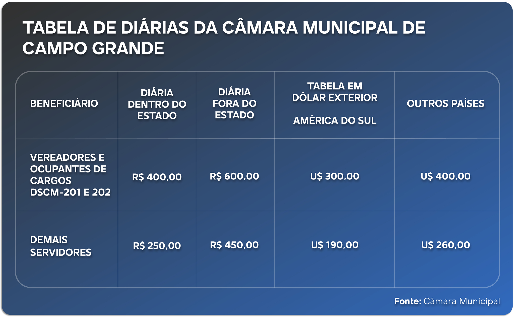 Para viagens a outros estados, a diária dos vereadores é de 40 Uferms, o equivalente a R$ 2.117,20. Para Campo Grande e demais cidades de Mato Grosso do Sul, o valor é de 20 Uferms, ou R$ 1.058,60. A lei também define as diárias dos servidores municipais conforme a classe funcional, com valores que variam de R$ 688,09 a R$ 1.799,62.