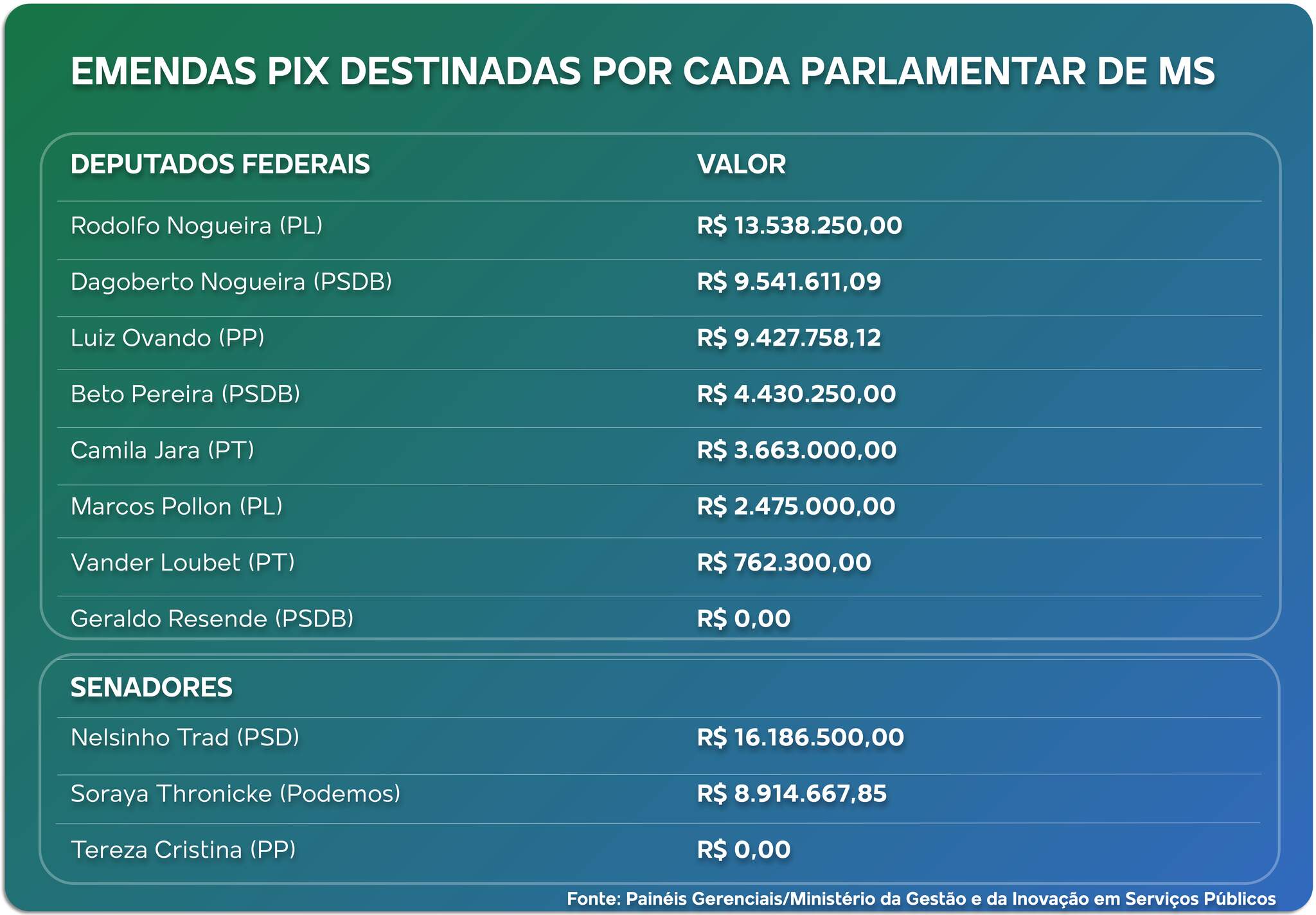 Ranking – De acordo com dados do Painel Parlamentar do MGI (Ministério da Gestão e da Inovação em Serviços Públicos), em 2025, foram 54 beneficiários com as emendas Pix este ano, o que inclui prefeituras e o Estado de Mato Grosso do Sul. São 58 planos de ação em execução, já que há casos de parlamentar destinar recursos para a mesma prefeitura mais de uma vez.