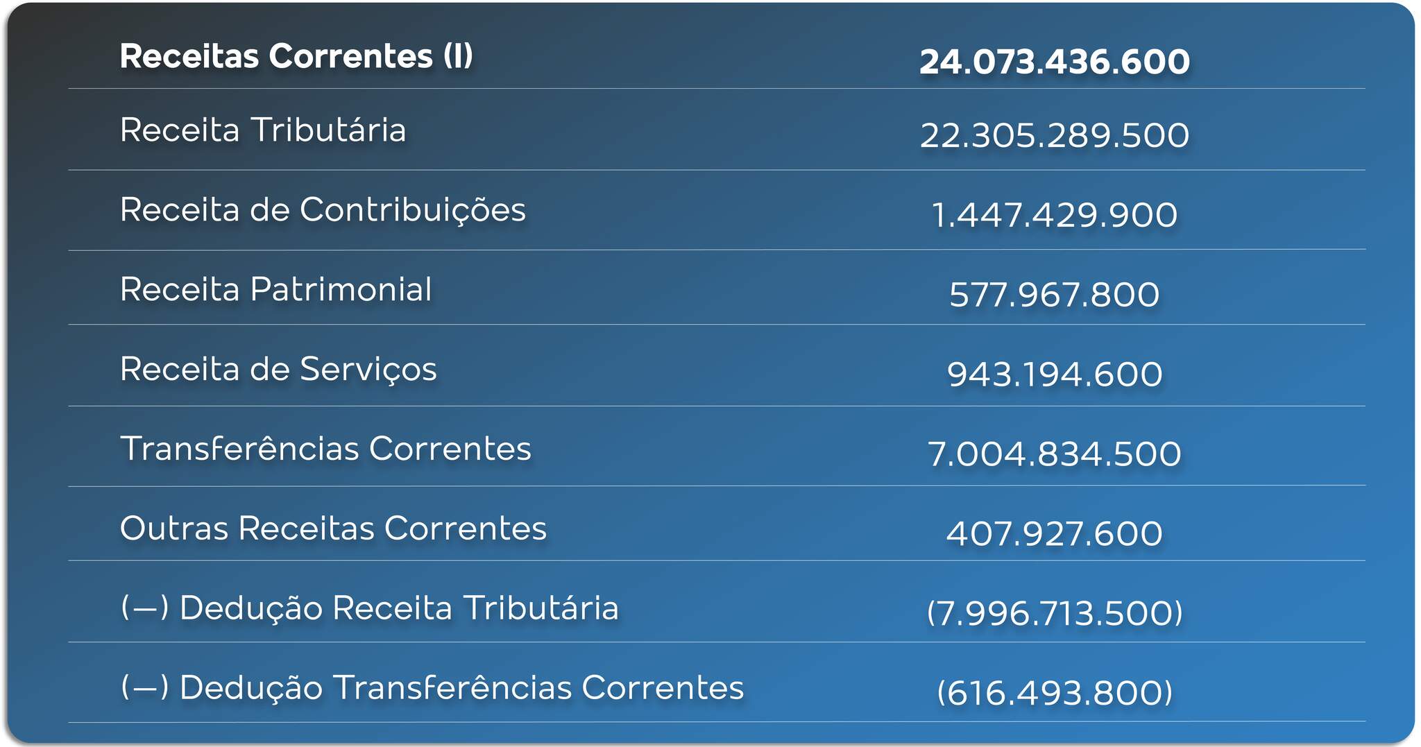 As receitas correntes, que incluem tributos e outras fontes recorrentes, somam R$ 24,07 bilhões. A maior parcela vem da receita tributária, que totaliza R$ 22,3 bilhões. Em seguida aparecem as transferências correntes, com R$ 7 bilhões, as receitas de contribuições, no valor de R$ 1,45 bilhão, as receitas patrimoniais, que somam R$ 578 milhões, e as receitas de serviços, no montante de R$ 943 milhões. Há também outras receitas correntes de R$ 407 milhões.