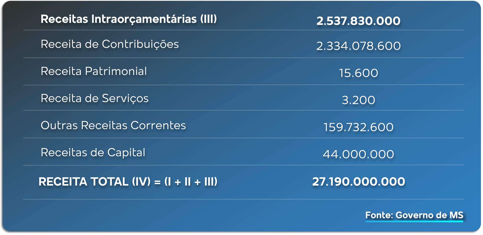 Esses valores já consideram repasses para encargos previdenciários à Agência de Previdência Social de Mato Grosso do Sul, receitas patrimoniais internas e Imposto de Renda Retido na Fonte.