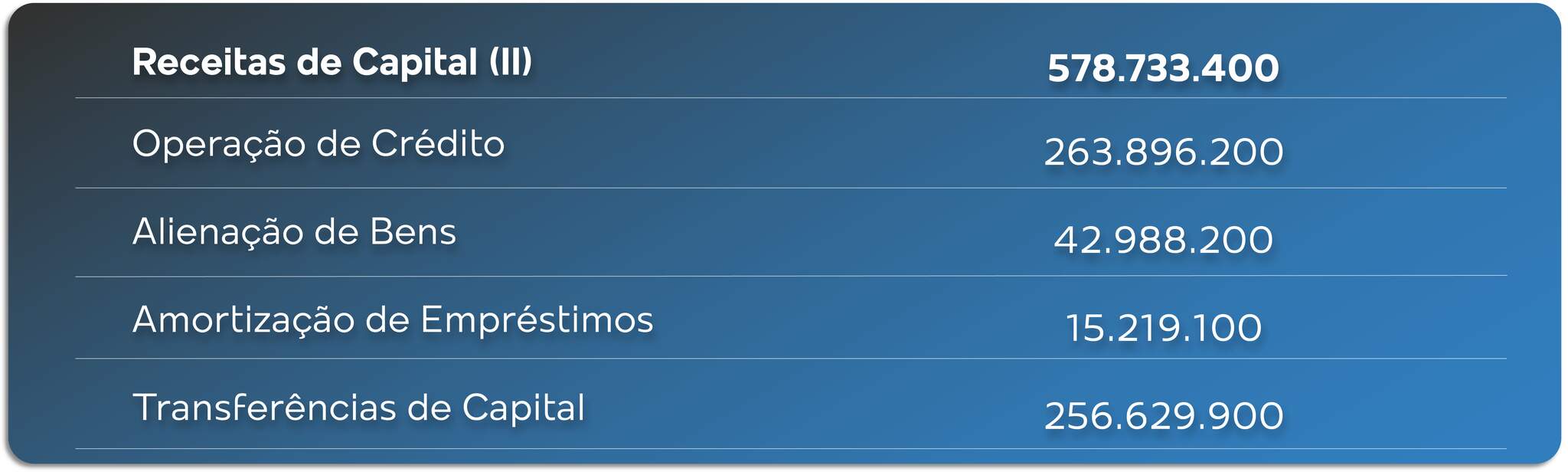 As receitas de capital, que englobam fontes não recorrentes, alcançam R$ 578,7 milhões. Desse total, R$ 263,8 milhões correspondem a operações de crédito, R$ 42,9 milhões à alienação de bens, R$ 15,2 milhões à amortização de empréstimos e R$ 256,6 milhões às transferências de capital.