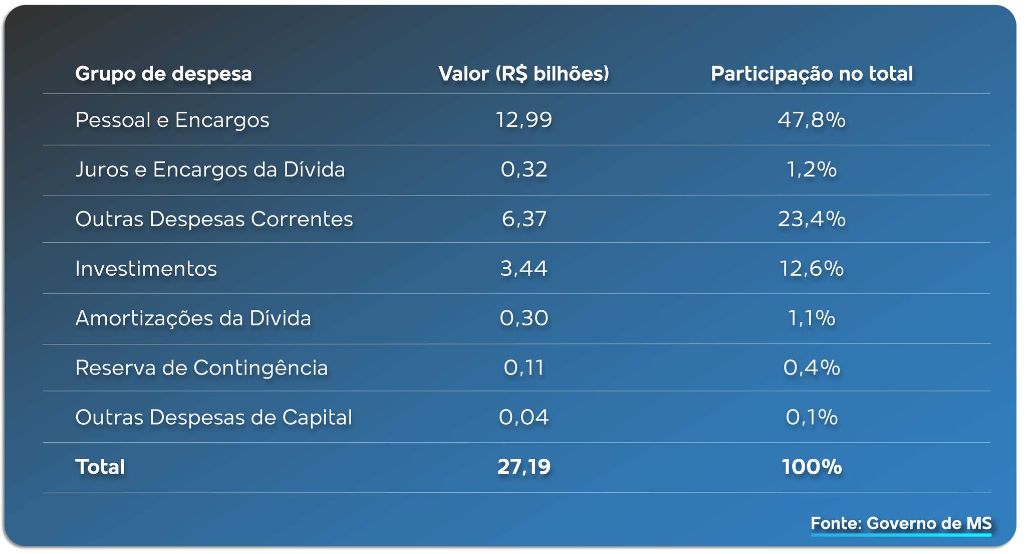As despesas correntes representam R$ 19,67 bilhões. Dentro desse grupo, a maior parcela corresponde à folha de pagamento e encargos sociais, que totaliza R$ 12,99 bilhões, o que equivale a 47,8% do orçamento total. Juros e encargos da dívida somam R$ 317,6 milhões e as demais despesas de custeio chegam a R$ 6,37 bilhões.