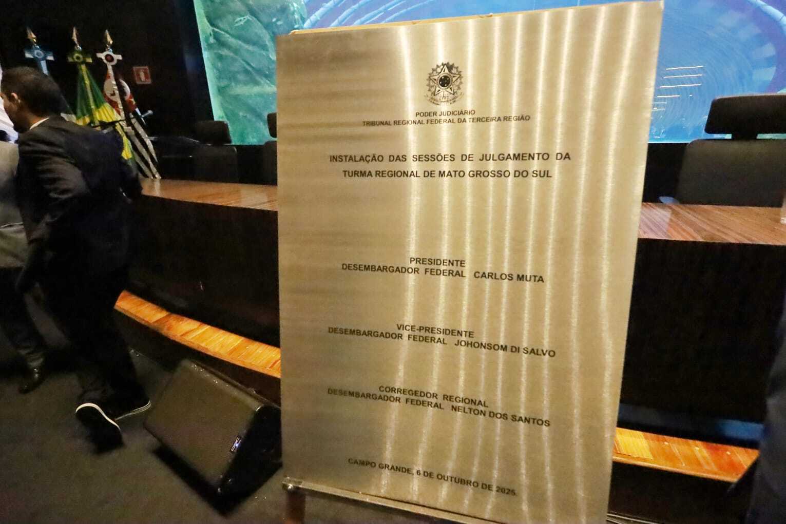 Placa de instalação das sessões do Tribunal Refional Federal em Mato Grosso do Sul. (Foto: Paulo Francis)
