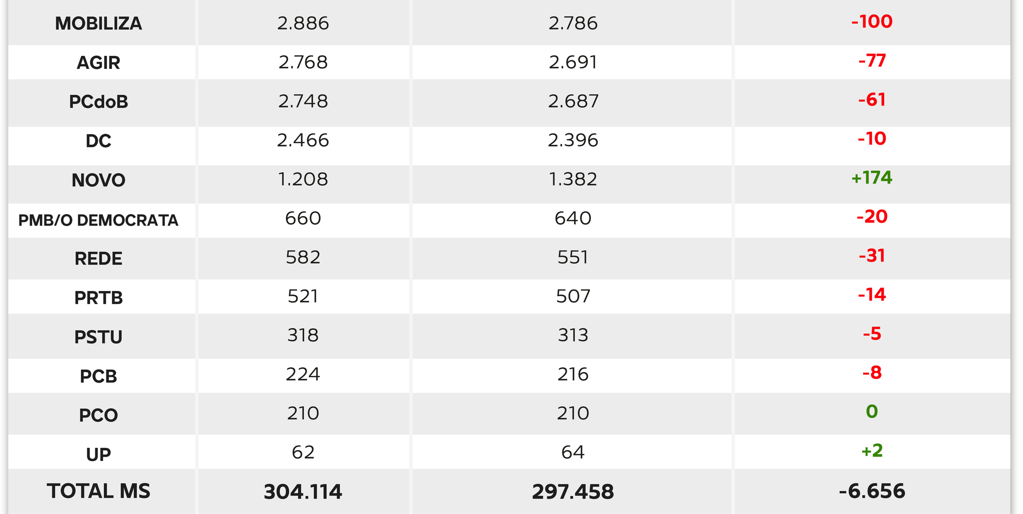 A redução total de filiações em MS foi puxada principalmente pelos partidos de maior porte, que perderam filiados em números absolutos mais elevados.