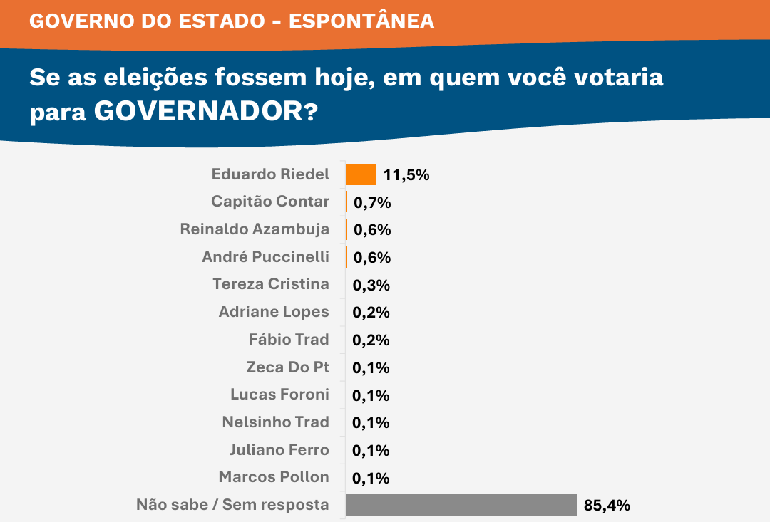 Na modalidade espontânea, quando não são apresentados nomes dos candidatos, Eduardo Riedel tem 11,5%. Depois aparece o ex-deputado estadual Renan Contar, o Capitão Contar (PL), com 0,7%, que é cotado para disputar o Senado.