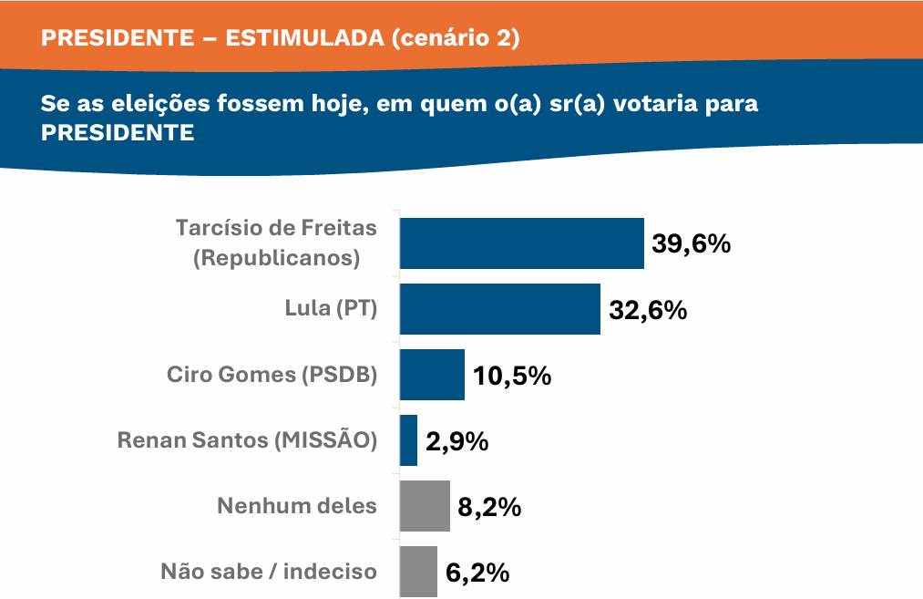 Presidência – A pesquisa traz quatro cenários para a eleição presidencial, com o atual presidente Luiz Inácio Lula da Silva (PT) sempre em segundo lugar. No primeiro quadro, o senador Flávio Bolsonaro (PL) tem 31,6% e Lula, 31,4%.