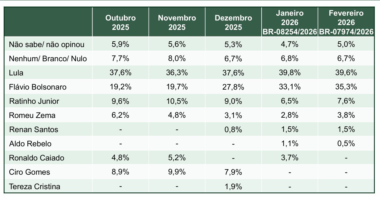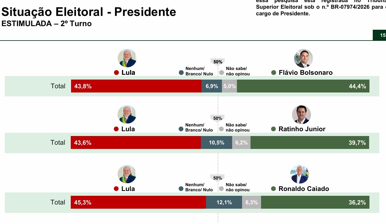 Segundo turno - O instituto também simulou cenários de segundo turno, apontando que o presidente perde para Flávio, por 44,4% contra 43,8%. Nesse contexto, 6,9% não votariam em nenhum dos dois e 5% não responderam ou não opinaram. O levantamento sugere que o filho do ex-presidente seria o nome mais competitivo na sucessão.